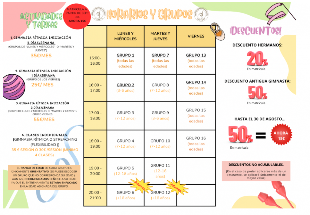 Importante : el RANGO DE EDAD de cada grupo es únicamente ORIENTATIVO (se puede escoger un grupo que no corresponda a la edad del gimnasta). Aun así, RECOMENDAMOS ceñirse a su edad, ya que el entrenamiento estará enfocado en la edad asignada del grupo.